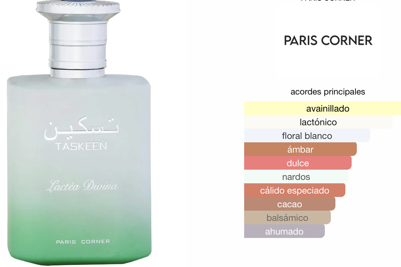 Taskeen Lactéa Divina de PARIS CORNER es una fragancia de la familia olfativa para mujeres.
